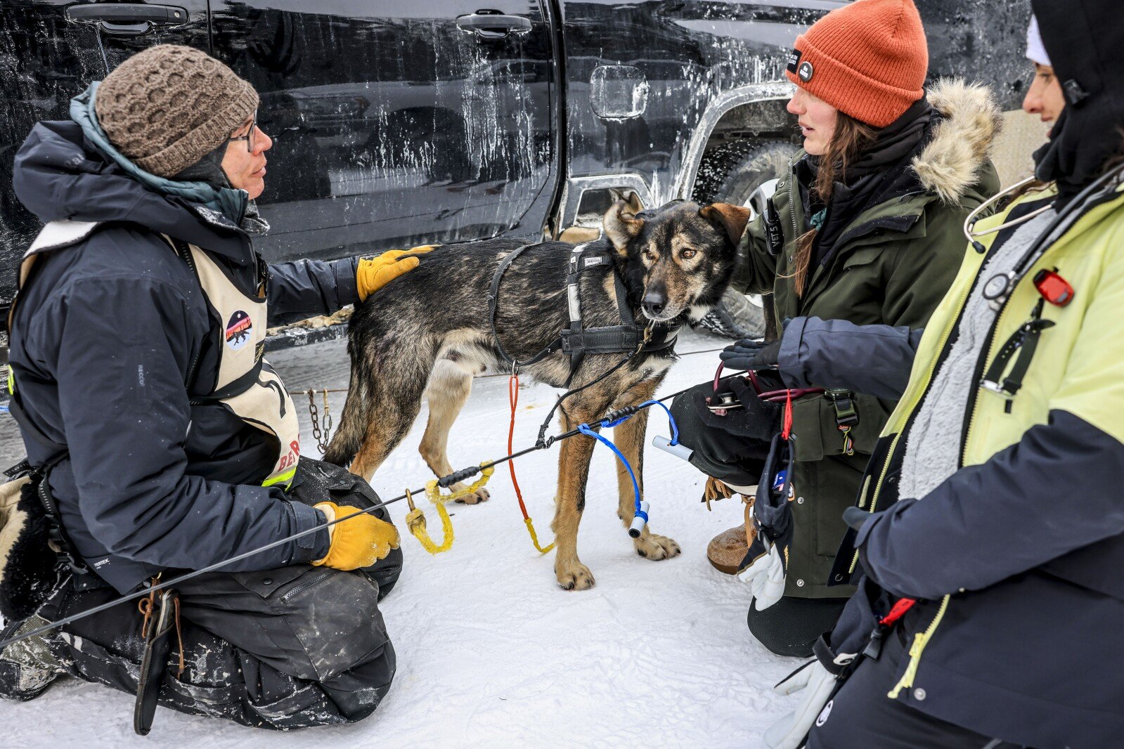 The 70-pound dog rode in the sled for several hours until the team reached Trail Center, just over the halfway point in the 300-mile race. There, veterinarians Jessica Esienbarth and Kevin Kicker examined him to make sure nothing more serious was going on and helped get him fluids.