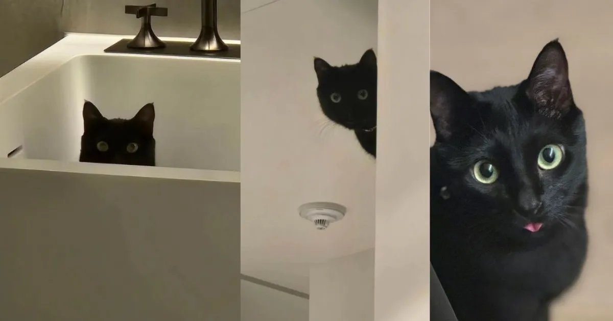 The first photo in the set is a total mood. Tang is just peeking out from inside the edge of a bathtub. You can only see those big, inquisitive eyes and some perky ears. The rest of him is hidden. And then the next shot shows him way up high. He is perched on a shelf or maybe the fridge. He is peeking around a wall from his high vantage point.