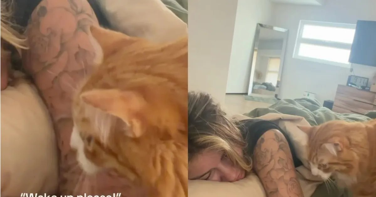 In the video, these breakfast-hungry cats arrive with unusually gentle manners and very clear goals. Artemis and Charlie curl around their sleeping owner and wait by her pillow. They try soft taps instead of morning chaos.