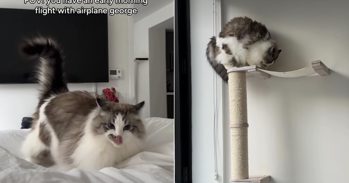 A video shared on Instagram by @sirgeorge features a Ragdoll cat named George, whose early morning antics have been humorously compared to an airplane taking off. The clip opens with on-screen text reading, “POV: you have an early morning flight with airplane George.”