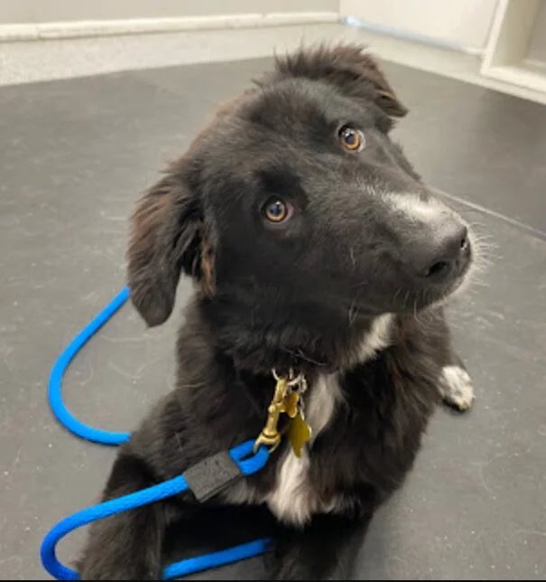 Alt text: Black dog with a blue leash lying on a gray floor, looking up with curious eyes.