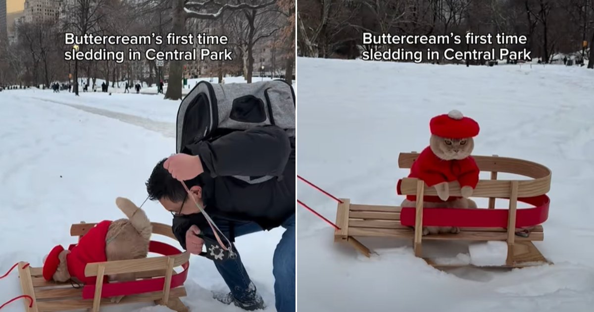 The video’s on-screen caption reads, “Buttercream’s first time sledding in Central Park,” and the clip starts with the cat perched on his dad’s shoulder. He then carefully climbs down into the sled. Meanwhile, his mom records the moment while giggling in the background, and Buttercream sits in place like a tiny passenger who did not ask for this adventure but will tolerate it anyway.