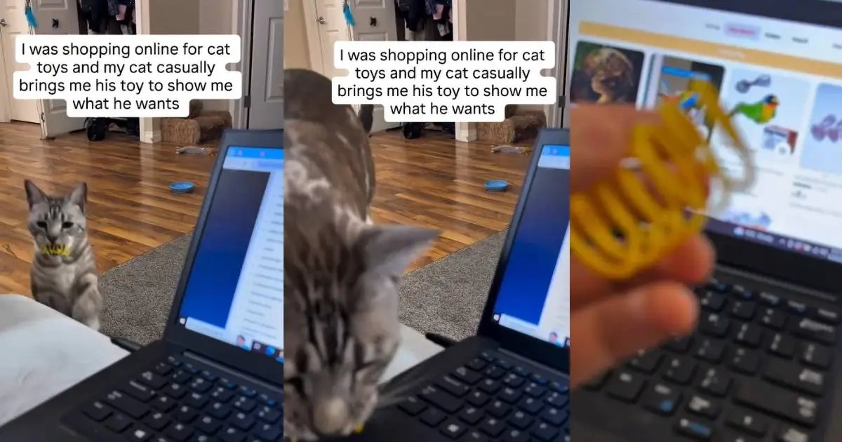 The adorable video from @threenawtycats starts with a Bengal cat called Prince noticing his owner looking for cat toys online. He hops up onto the table and places a bright yellow spring toy down in front of the computer to express his choice. The owner picks up the spring, looks at it, and responds with “Okay.” After finishing his mission, Prince hops right back off.