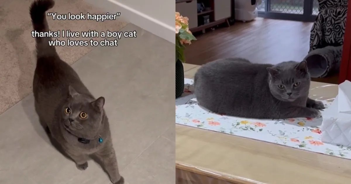 The video uploaded by @honchuthebluebrit shows a British Shorthair cat named Honchu enthusiastically “chatting” with his owner. Text displayed on the screen reads, “You look happier. Thanks! I live with a boy cat who loves to chat,” setting the tone for the wholesome interaction that follows.
