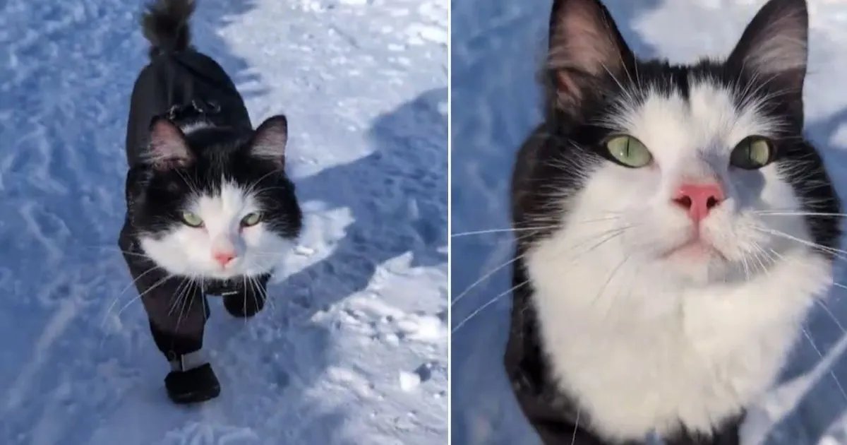 If you needed proof that cats can outperform supermodels, this hilarious TikTok video of a cat walking in snow is all you need. TikTok user @raw_fed_kitties shared the video of a black-and-white tuxedo domestic shorthair named Cat marching down a snowy path in tiny boots and a snug black winter suit.